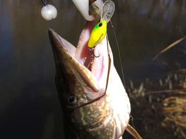 Решил рискнуть, ибо отцеп у меня с собой. Я прицепил к поводку точно такой же Mottomo Chubber, только ярко-желтый и с заглублением DR, то есть с рабочим горизонтом более метра. Но вот незадача, третьей рыбой опять оказалась щучка.